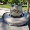 Oblikovalen zahodni slamnati klobuk z zanimivo barvo in okrasnim trakom. Z elastičnim notranjim trakom.